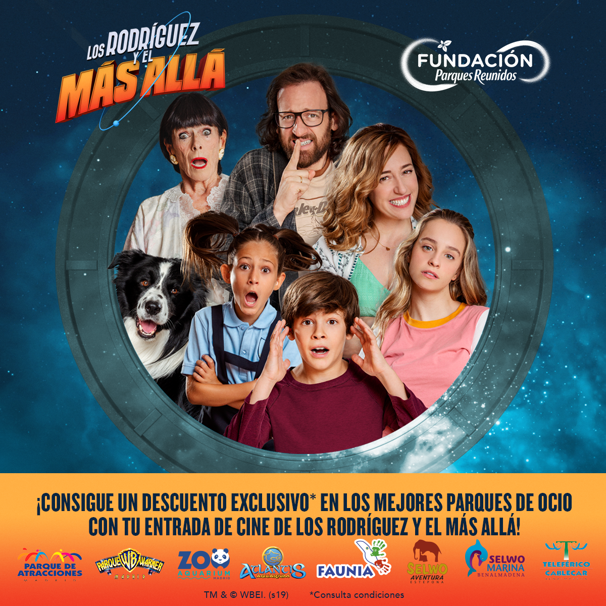 - 50% de descuento para portador de la entrada de cine película “Los Rodríguez y el más allá” en la compra de una entrada general de adulto en las taquillas de Parque de Atracciones de Madrid, Parque Warner Madrid, Zoo Aquarium de Madrid, Faunia, Atlantis Aquarium Madrid, Teleférico de Benalmádena, Selwo Aventura Estepona o Selwo Marina Benalmádena. No se aceptarán entradas fotocopiadas, manipuladas o deterioradas. Descuento no reembolsable por su valor económico. Prohibida su venta. Promoción no aplicable a otros tipos de entrada y/o tarifa. Parkings no incluidos. No acumulable a otras ofertas y/o promociones. Consulta calendario, horarios de apertura y normas de los parques en las webs de los mismos. Válido del 1 al 3 y del 8 al 10 de noviembre de 2019.
